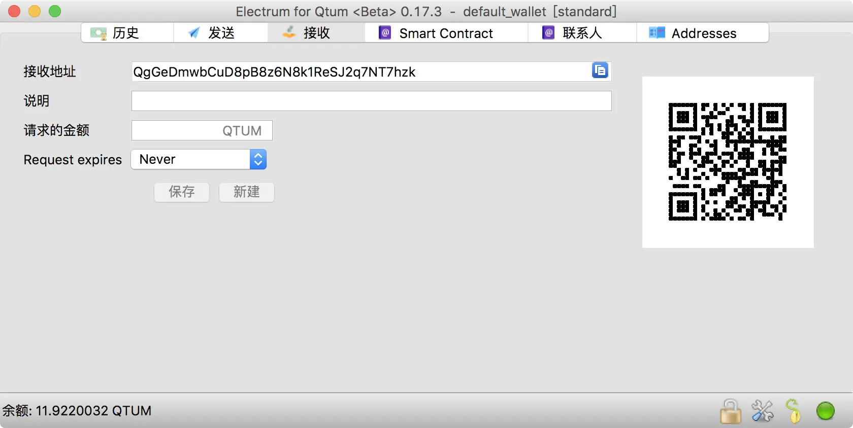 在 “接收” 页,我们可以将地址或者二维码拷贝下来,发送给其他人。 由于Qtum Electrum使用的是一个助记词管理多个地址的模式,因此你会发现接收地址会经常变化。