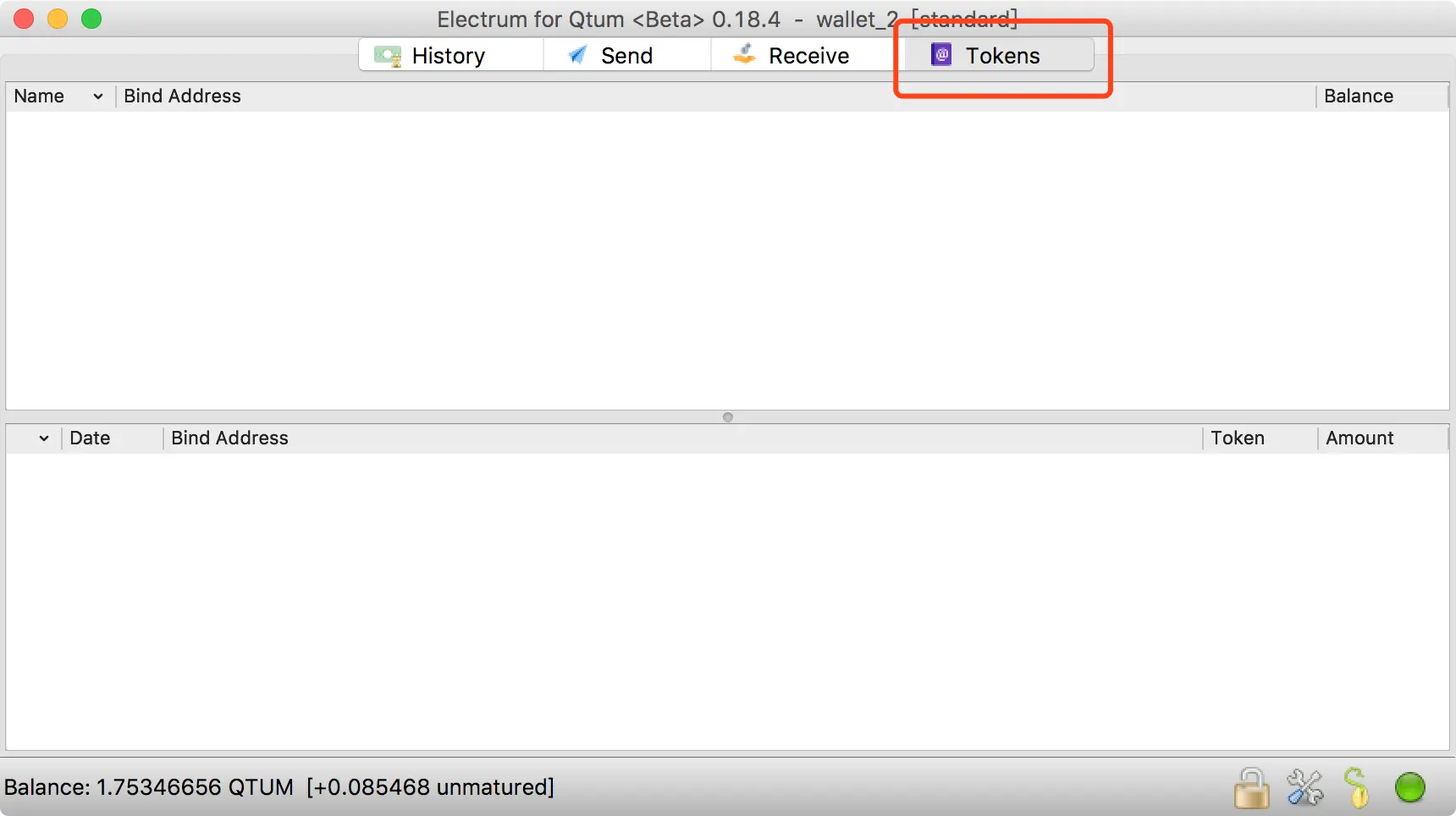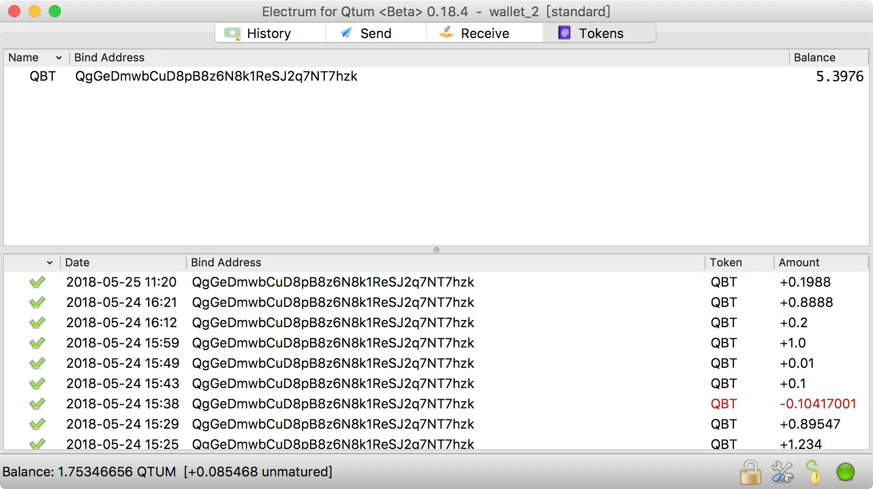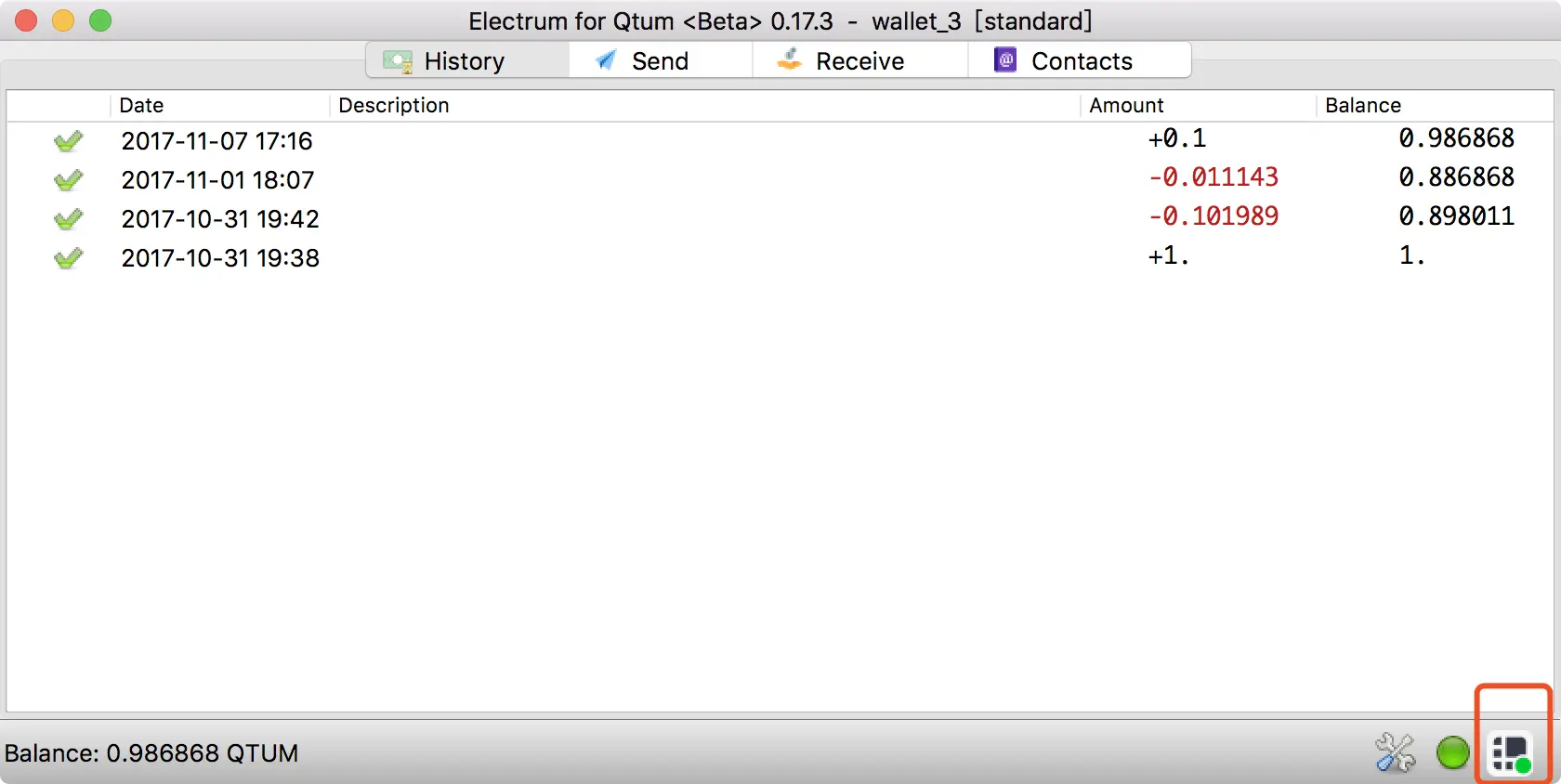 Qtum Electrum 的界面非常简洁,点击顶部的按钮可进行tab间的切换。