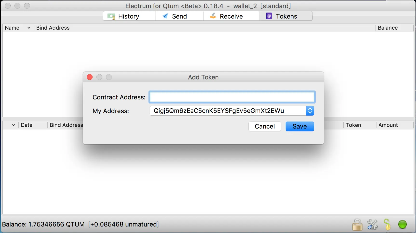 在添加Token的页面填入Token的合约地址,从下拉菜单选择需要绑定的钱包地址。合约地址可以从区块浏览器qtum.info/中根据Token名称搜索到。