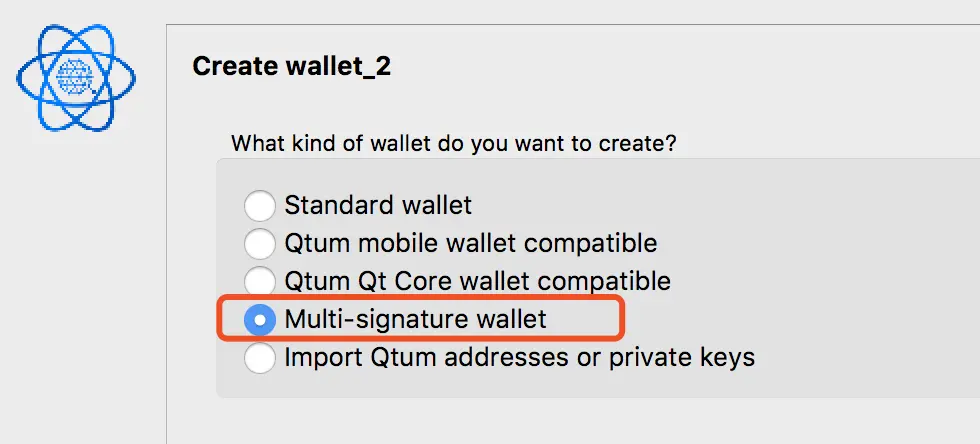 在 Qtum Electrum 中创建多重签名钱包非常简单。 在创建钱包的时候选择"Multi-signature wallet"