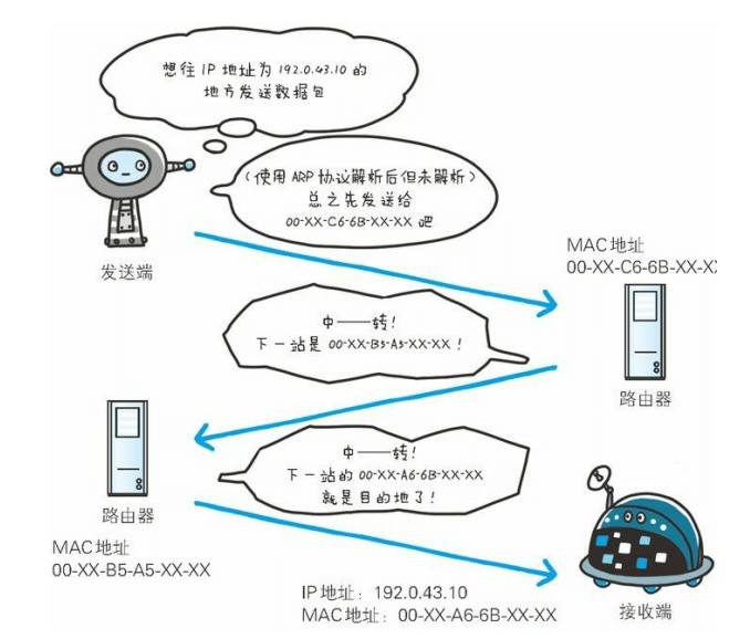 IP协议的作用是把各种数据包传送给对方。而要确保传送到对方那里,则需要满足各类条件。其中最重要的条件是IP地址和MAC地址(网卡所属的固定地址)