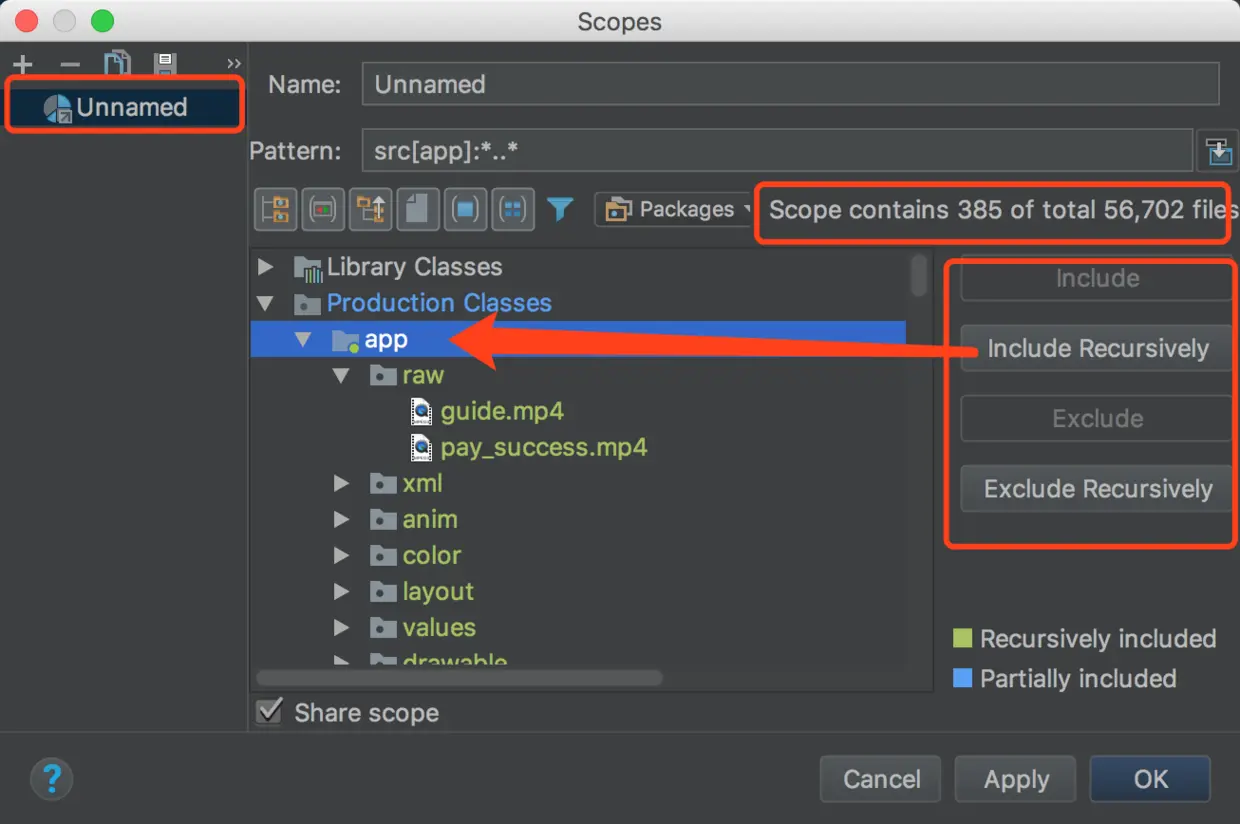 根据右侧四个按钮的提示:Include(包括当前文件夹内的文件,但不包括其子文件夹)、Include Recursively(包括当前文件夹,及其子文件夹内所有的文件夹)、Exclude(移除当前文件夹,但不包括子文件夹)、Exclude Recursively(移除当前文件夹、及其所有子文件夹),来制定规则。
