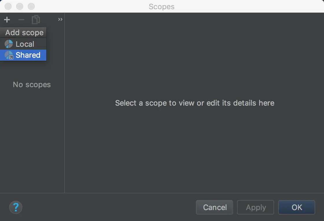 点击左上角'+'添加一个检查范围,可选项有Local(只能当前项目使用)和Shared(其他项目也可使用)。