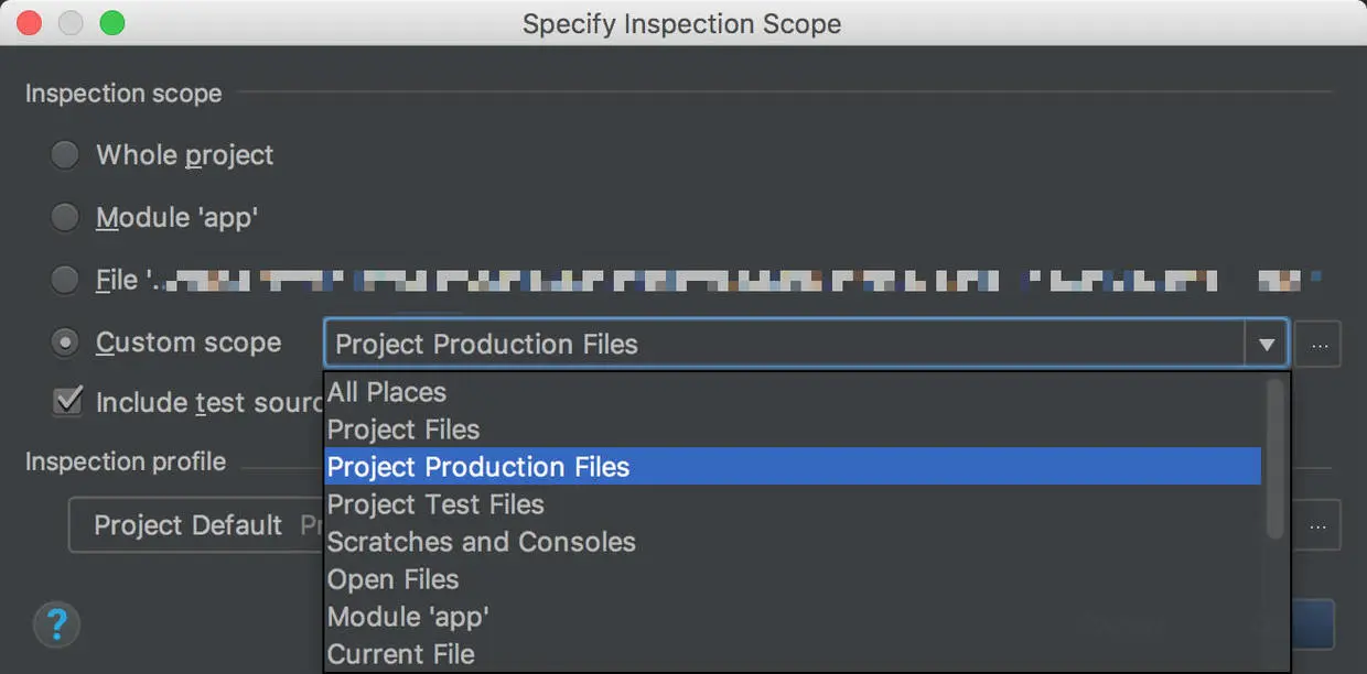 默认选项是Whole project(整个项目),还可以选择Custom scope自定义文件,有多个选项:Project Files(所有项目文件)、Project Production Files(项目的代码文件)、Project Test Files(项目的测试文件)、Open Files(当前打开的文件)、Module 'app'(主要的ap 模块)、Current File(当前文件)。