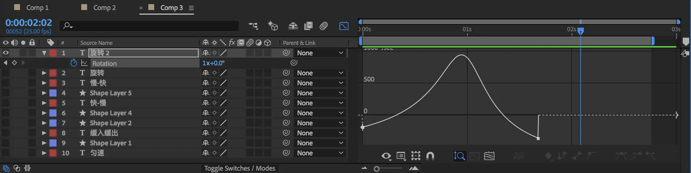 与位移的速度曲线不同的是,旋转物体的速度曲线是可以有负值的。加入负值时,会往与结束方向相反的方向先弹一下。同样,在第二帧结束时的曲线拉负数,旋转则会回弹一下,这种方式可以让你的设计有回弹的效果,增加吸引力。
