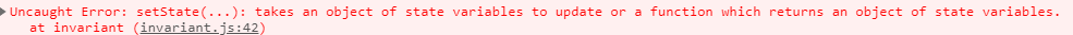 @param callback 回调函数,后面专门开一篇来讲解invariant这段代码主要对参数作了一些验证 ,所以 setState()只接受三种类型的参数,比如 object,function和与null 恒等的,比如undefined ,false . 如果你使用这三种判定类型之外的情况,会优雅的提示你错误,比如下面这个代码 :