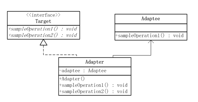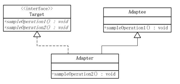 适配器角色Adapter拓展了Adaptee,同时又实现了目标角色Target接口。由于Adaptee没有提供sampleOperation2()方法,而目标接口有要求这个方法,因此适配器角色Adapter实现了这个方法。