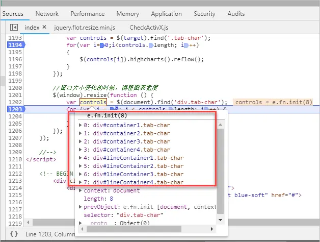 参考下图表的Tab标签页的HTML代码,我们注意到 class="tab-pane” 和 class="tab-char"的两个DIV层,这些就是我们利用JQuery来动态查找图表控件并进行处理的关键。