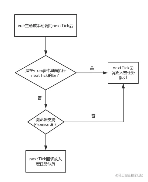 纠正:2022-06-28 上图中 "浏览器支持 Promise 吗?" 在 是 的分支 结果中 应该是 "nextTick 回调放入微任务队列"