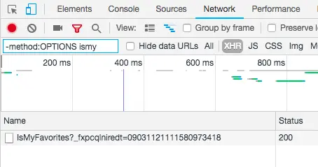 如果此时我只想看 IsMyFavorites 这个接口呢 可以是使用这样语法 -method:OPTIONS ismy -method:OPTIONS 表示请求的方法为 OPTIONS 的接口不显示,这是因为跨域调用接口时,会额外发送一个 OPTIONS 接口