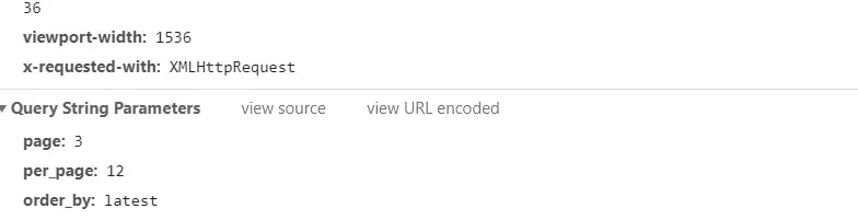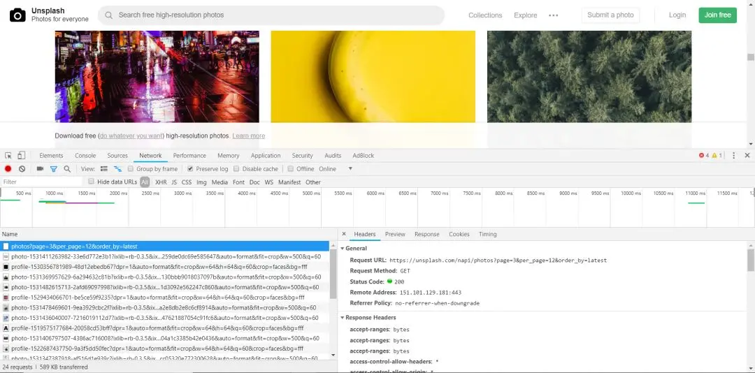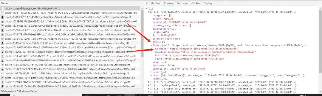 往下拉的时候很容易看到这个请求,这个是一个get请求,状态码为200,网址为https://unsplash.com/napi/photos?page=3&per_page=12&order_by=latest,有三个参数,很容易知道page参数就是页,这个参数是变化的,其他的参数都是不变的。