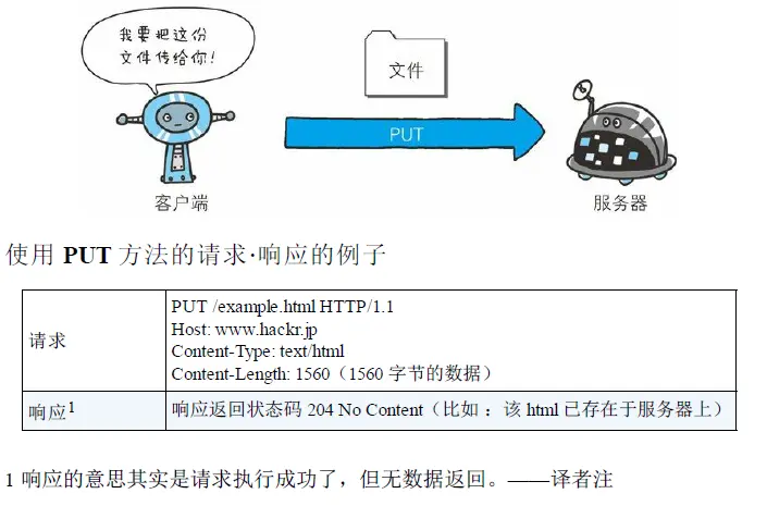 - PUT方法。传输文件。就想FTP协议中的请求文件上传一样,要求在请求报文的实体中包含文件内容,然后保存到请求的URI指定的位置。但是鉴于HTTP1.1的PUT方法自身不带有验证机制,任何人都可以上传文件,存在安全问题,因此一般的网站不选用这种方式。如果配合Web应用程序的验证机制,或架构设计采用REST标准的同类Web网站,就可能会开放使用PUT方法。