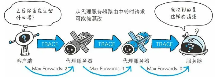 - TRACE。追踪路径。让web服务器将之前的请求通信环回给客户端的方法。发送请求的时候,在Max-Forwards首部字段中加入数值,每经过一个服务器端该数字就减一,当数值刚好减到0的时候,就停止传输,最后收到请求的服务器返回的200OK的响应。