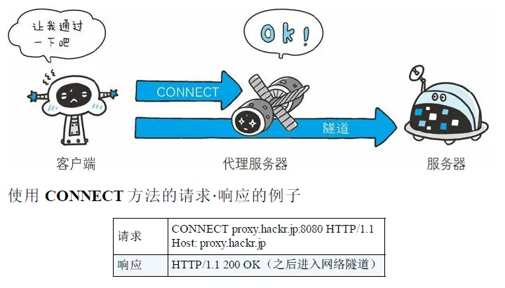 CONNECT方法。要求隧道协议连接代理 CONNECT方法要求在与代理服务器通信的时候建立隧道,实现用隧道协议进行TCP通信。主要使用SSL(secure sockets layer,安全套接层)和TLS(Transport Layer Security,传输层安全)协议把通信内容加密后经过网络隧道传输。 CONNECT方法的格式如下: CONNECT代理服务器名:端口号 HTTP版本