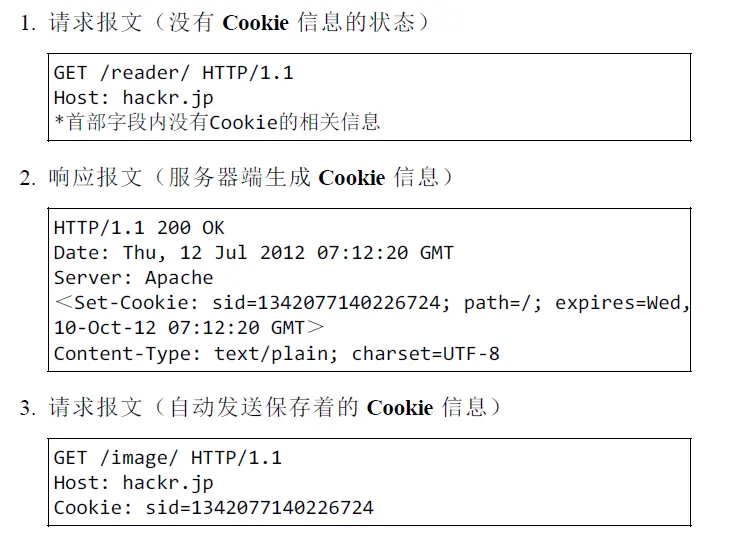 Cookie的工作原理:Cookie会根据从服务端发送的响应报文中的一个称set-Cookie的首部字段中,通知客户端保存Cookie。当客户端下次再往服务端发送请求的时候,客户端会自动在请求报文中加入Cookie值发送出去。