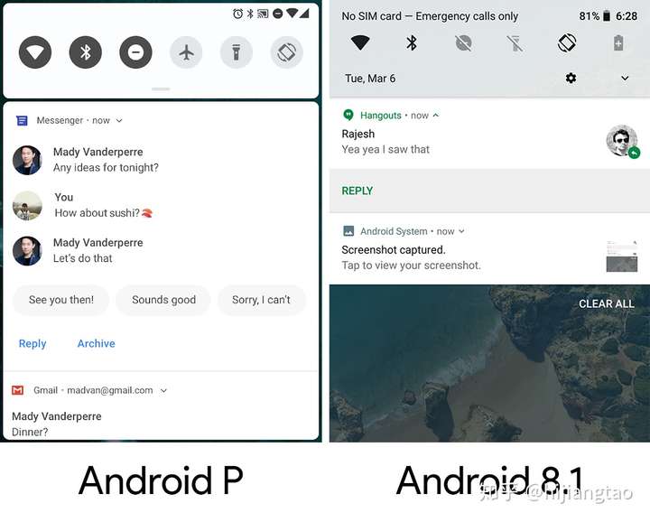 举一个常见的社交场景:当用户在同时与不同好友进行聊天时,在 Android 8.1 上只会在通知面板显示该应用的未读信息,但 Android P 开始让应用通知有能力同时提供上下文信息,方便用户理解并提供有开发者定义的快捷回复允许用户进行快捷回应。下图为 Android P 与 Android 8.1 在此场景下的展示差异。