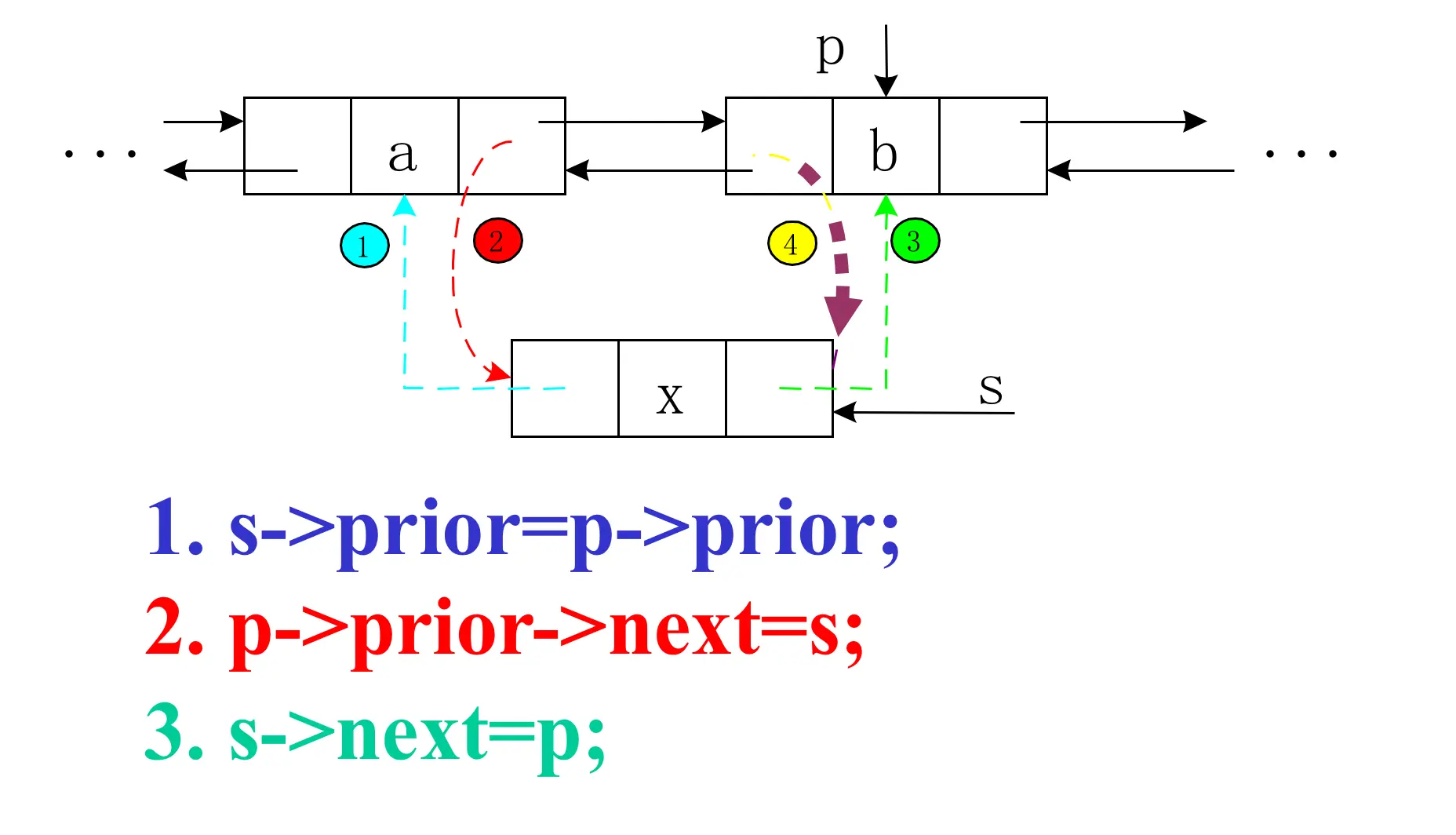 在某个位置插入一个结点。双向链表的插入步骤;