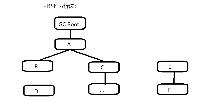 在主流商用语言(如Java、C#)的主流实现中, 都是通过可达性分析算法来判定对象是否存活的: 通过一系列的称为 GC Roots 的对象作为起点, 然后向下搜索; 搜索所走过的路径称为引用链/Reference Chain, 当一个对象到 GC Roots 没有任何引用链相连时, 即该对象不可达, 也就说明此对象是不可用的, 如下图:虽然E和F相互关联, 但它们到GC Roots是不可达的, 因此也会被判定为可回收的对象。