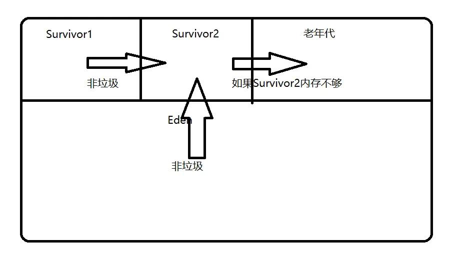 现代商用VM的新生代均采用复制算法, 但由于新生代中的98%的对象都是生存周期极短的, 因此并不需完全按照1∶1的比例划分新生代空间, 而是将新生代划分为一块较大的Eden区和两块较小的Survivor区(HotSpot默认Eden和Survivor的大小比例为8∶1), 每次只用Eden和其中一块Survivor. 当发生MinorGC时, 将Eden和Survivor中还存活着的对象一次性地拷贝到另外一块Survivor上, 最后清理掉Eden和刚才用过的Survivor的空间. 当Survivor空间不够用(不足以保存尚存活的对象)时, 需要依赖老年代进行空间分配担保机制, 这部分内存直接进入老年代。
