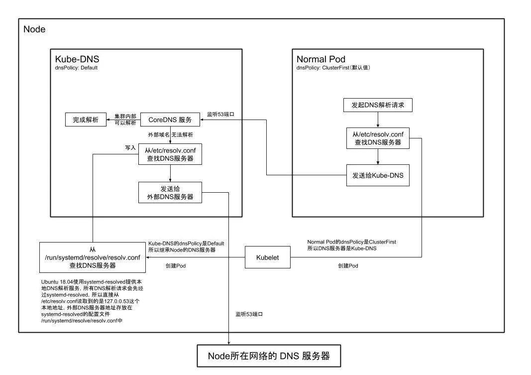* 在Ubuntu 16.04中也是类似的逻辑,只不过systemd-resolved换成了dnsmasq,监听地址是127.0.1.1 * 在具体实践过程中,也顺便探究了CoreDNS和KubeDNS架构和解析逻辑上的区别,不过不在此问题的讨论范围,有兴趣的朋友可以自己看一下。 * 如果Kubernetes集群是安装在NAT网络下的虚拟机上,虚拟机(也就是Kubernetes集群中的Node)中/etc/resolv.conf文件可能被修改为NAT的地址,也就不会出现上面这个问题。