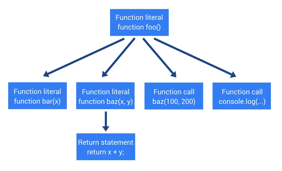 声明 baz 函数接收两个参数(x 和 y)。有一个返回语句。函数函数 x 和 y 相加结果。