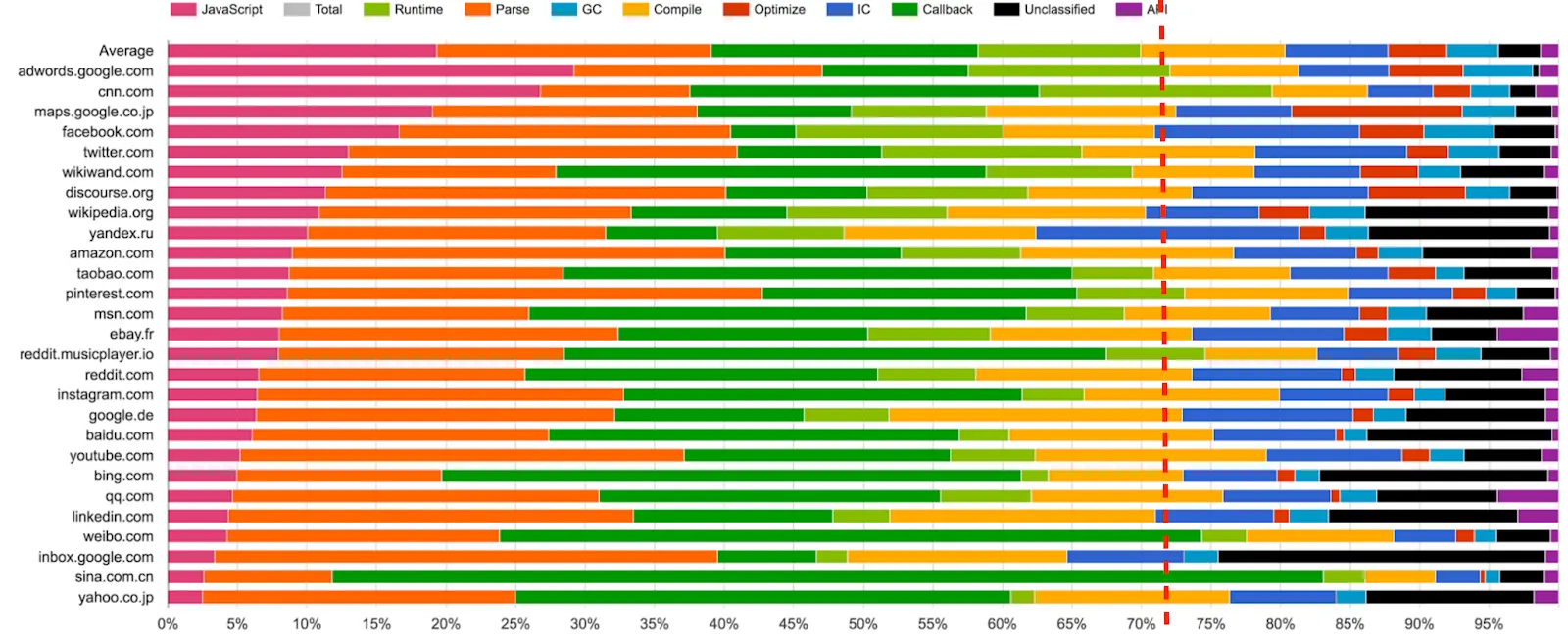 也许你会问为什么我得学习 JavaScript 解析器的工作原理。反正,浏览器会负责运行 JavaScript 代码。你有那么一丁点是正确的。以下图表展示了 JavaScript 运行过程中不同阶段的耗时。瞪大眼睛瞅瞅,也许你可以发现点有趣的东西。