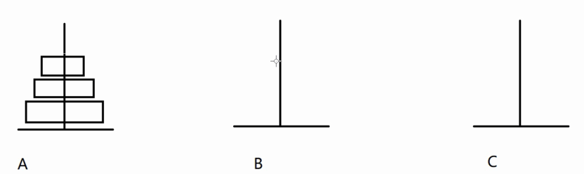 从左到右有A、B、C三根柱子,其中A柱子上 面有从小叠到大的n个圆盘,现要求将A柱子上的圆盘移到 C柱子上去,期间只有一个原则:一次只能移到一个盘子且 大盘子不能在小盘子上面,求移动的步骤