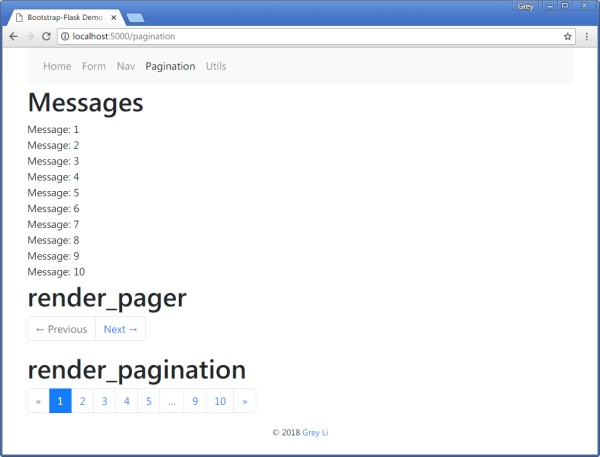 $ flask run现在访问http://localhost:5000即可看到示例程序主页。示例程序包含所有宏的实际调用示例,其中分页宏示例页面如下图所示: