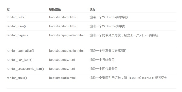 目前,Bootstrap-Flask一共提供了7个宏,分别用来快捷渲染各类Bootstrap页面组件,并提供了对扩展Flask-WTF、Flask-SQLAlchemy的支持。