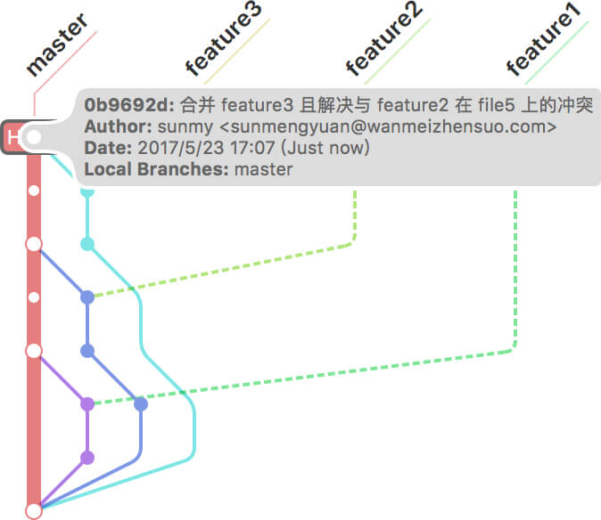 其中 feature2 与 feature3 需要修改同一文件,我们故意制造了一个冲突:
