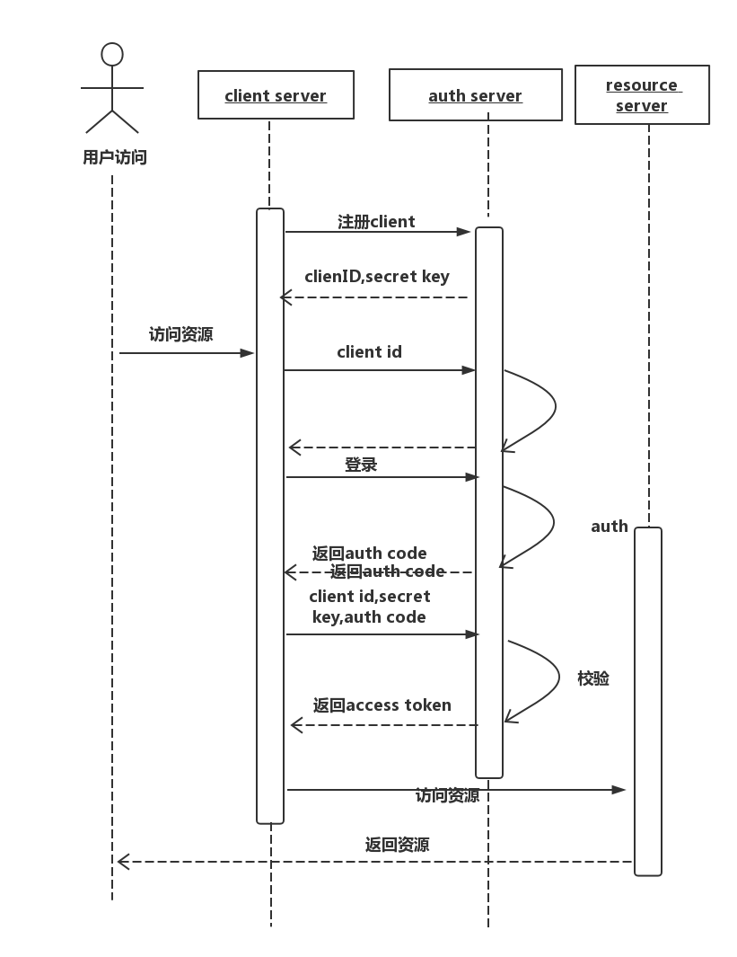 从图中我们可以看出大概的流程,用户访问资源的时候首先要经过授权服务的授权,访问授权服务的过程用户通过客户代理带上注册好的Clent ID 和重定向的地址,授权服务验证好是否正确之后会给到客户代理一个授权码,把授权码带给客户端,客户端可以通过此授权码才能获取可访问的Access Token。前面有总结过,只有拿到有效的Access Token才能畅通的访问到我们的资源服务。