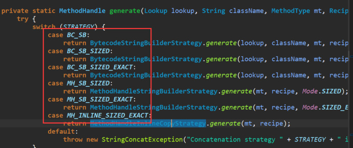 有六种策略,前五种还是用StringBuilder实现,而默认的策略MH_INLINE_SIZED_EXACT,这种策略下是直接使用字节数组来操作,并且字节数组长度预先计算好,可以减少字符串复制操作。实现的核心是通过 MethodHandle 来实现 runtime,具体实现逻辑在MethodHandleInlineCopyStrategy.generate方法中。