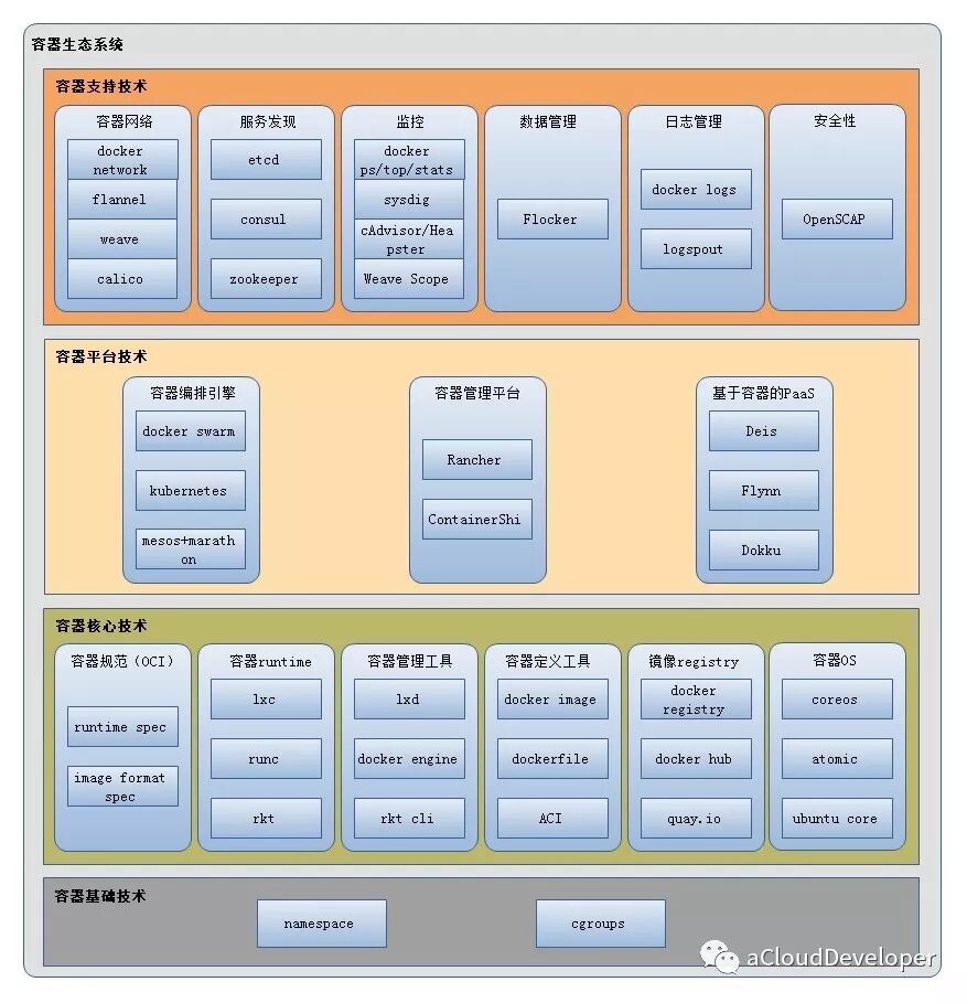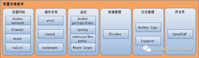 容器的出现又重新让一些古老的技术焕发第二春,如监控、网络、数据管理、日志等技术,由于容器技术的不同,需要制定相应的符合容器规范的技术框架,由此有了容器支持技术,用于支持容器提供更丰富能力的基础设施。