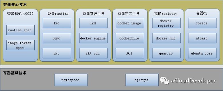 容器核心技术保证容器能够在主机上运行起来,包括容器规范、容器 runtime、容器管理工具、容器定义工具、Registry 和容器 OS。