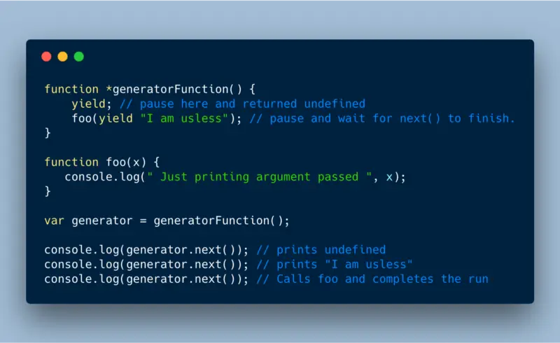 'I am usless',这一步为函数调用准备了参数。 - 第二个 next() 以 undefined 为参数调用了后面的函数。next() 没有接收参数,意味着上一个 yield 表达式的值为 undefined,所以函数打印出 undefined 并终止运行。