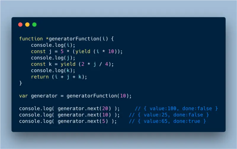 - next(5) 用 5 替换第二个 yield,所以 k 为 5。继续执行 return 语句,返回最后的 yield value (x + y + z) => (10 + 50 + 5) = 65,并且 done 为 true。