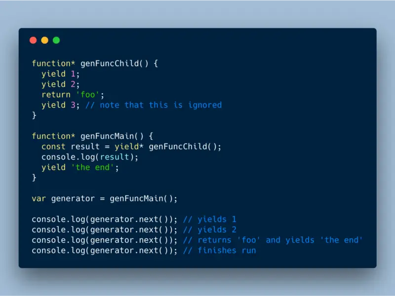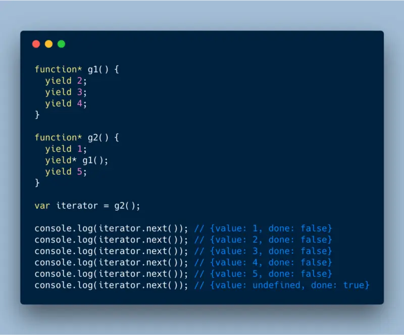 Yield 表达式的介绍就告一段落了,接着我们了解一下另一个表达式 yield*。Yield* 在 Generator 函数中使用时,会把迭代委托到下一个 Generator 函数。简单来说,会先同步完成 Yield* 表达式中的 Generator 函数,再继续运行外层函数。