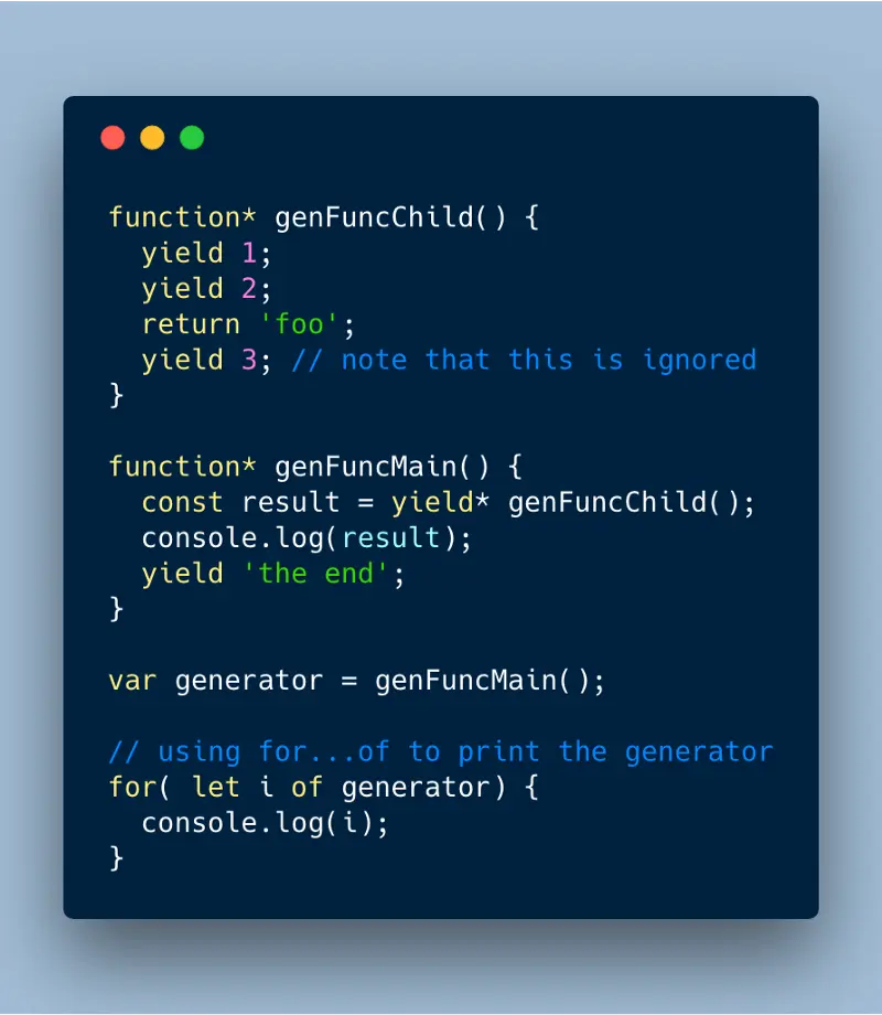 最后 return 的值不会被打印,因为 for…of 循环只迭代到最后一个 yield。因此,作为最佳实践,尽量避免在 Generator 函数中使用 return 语句,原因在于当使用 for…of 语句进行迭代时,return 会影响函数的可重用性。