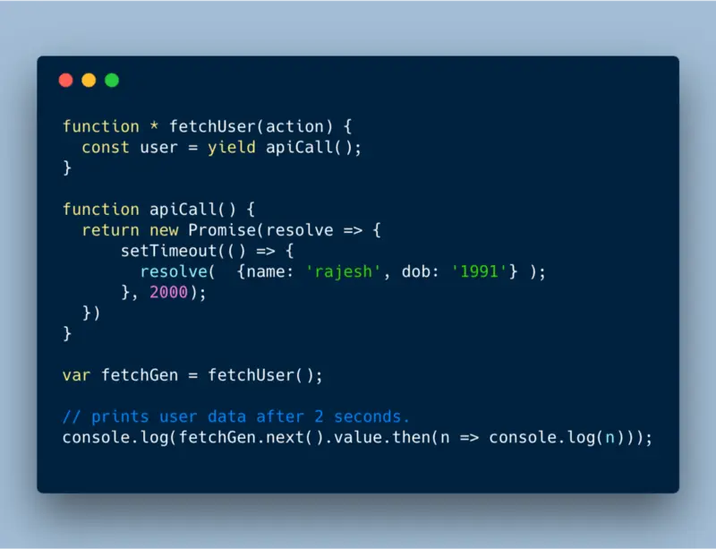 apiCall 将 promise 作为 yield value 返回,在 2 秒后 resolved 并打印出我们需要的值。