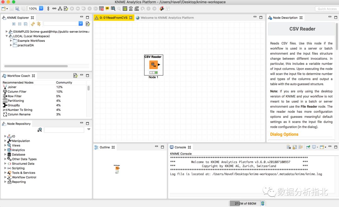 主界面虽然很多窗口,但组织的比较有逻辑性。左上,KNIME Explorer,是你所有的 KNIME 的工程目录,还有官方的例子服务器,里面内容很详尽,可以用来做学习的参考。