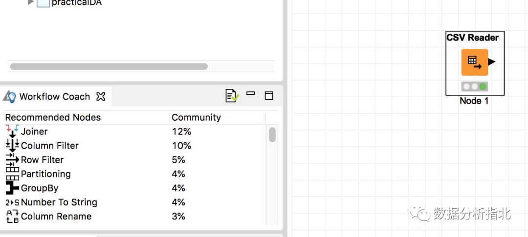 左中,就是一个比较有意思的功能了,Workflow Coach,比如在上图的这一个分析任务中,已经放入了一个读取CSV文件的模块,这个模块接下来需要连接什么模块,在 Workflow Coach 中会根据社区的统计信息,给出建议,比如在 CSV Reader 之后,他给出了如下的建议: