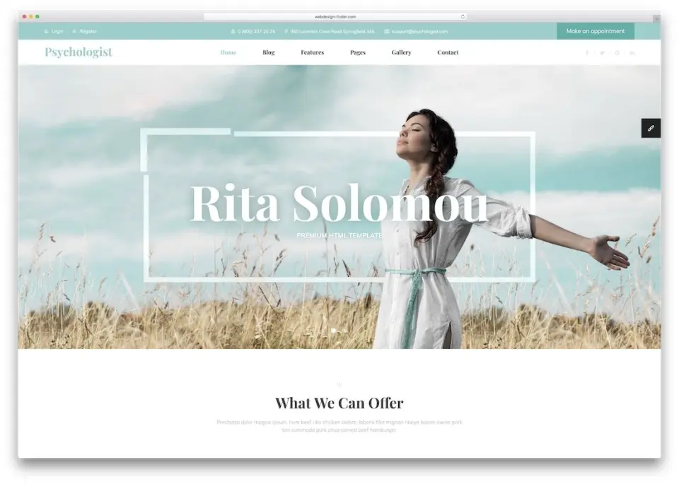 整体网页设计以淡绿色调为主,导航栏、字体、以及天空的颜色融为一体,是一个清新而又富有生命力的颜色。而网站响应能力和卓越性能是促成转化的一部分。作为心理健康类网页设计的模板,也可以给新手提供一个很好的参考。