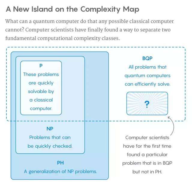 Aaronson 说,如果你想找到一个仅属于 BQP 而不属于 PH 的问题,你必须找到一个从定义上传统计算机不能有效证明答案的问题,这样的问题“传统计算机甚至不能有效地验证答案,更别说找到它了。这就排除了我们在计算机科学中所考虑的许多问题。”