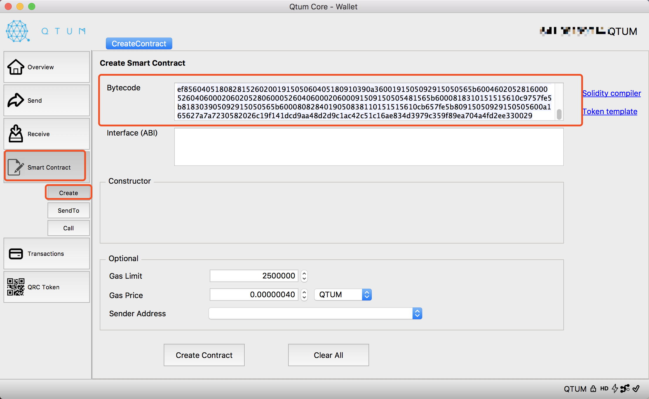 打开Qtum Core钱包,进入“Smart Contract” =》 “Create”, 将上一步所得的16进制BYTECODE粘贴到文本框中。