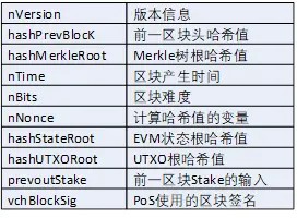 其中nVersion版本信息描述了当前Qtum区块链软件的版本,hashPrevBlock记录前一区块头哈希值,hashMerkleRoot记录本区块交易ID生成的Merkle树根节点哈希值,nTime记录区块产生的时间,nBit记录当前计算区块头哈希值的难度,nNonce与比特币兼容,但PoS阶段未使用,hashStateRoot记录本区块EVM执行完成后的根状态哈希值,hashUTXORoot记录本区块EVM执行完后产生的UTXO根状态哈希值,prevoutStake为前一区块用于PoS过程的交易输出点,vchBlockSig是PoS时使用的区块签名。