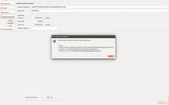 和智能合约的交互,同样要连接Qtum节点,通过PC钱包就可以了。生成需要交互的函数或公共变量的ABI数据可以参考4.3.1节。点击Sendto切换到合约交易生成界面,把Contract Address、ABI填好,从Functtion选择要调用的函数,有函数参数的话,在address dest面填写参数,GasLimit、GasPrice、和Sender Address可以根据需要设置。点击Send To Contract按钮即生成了合约交易, 完成和Qtum链上智能合约交互。