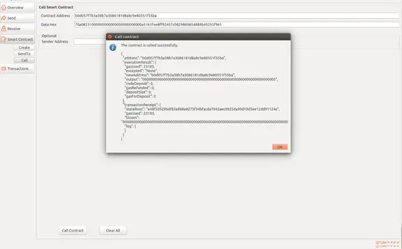 和callcontract一样可以通过qt钱包在本地调用智能合约相关函数或公共变量,其执行不会影响到链上的智能合约状态,一般用来查看智能合约在Qtum链上执行某个函数之后的结果。点击Call按钮切换到本地执行合约界面,把Contract Address、、ABI填好,有函数参数的话,在address dest面填写参数,从Functtion选择要调用的函数,Sender Address可选设置,最后点击Call Contract完成智能合约相关功能调用,合约执行的结果会在弹出的对话框中显示出来。