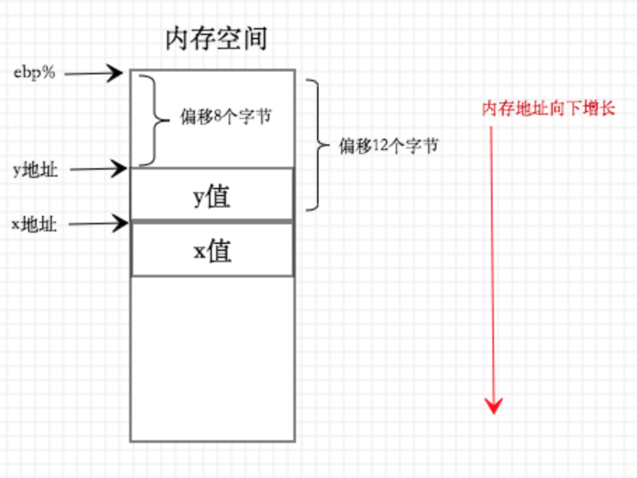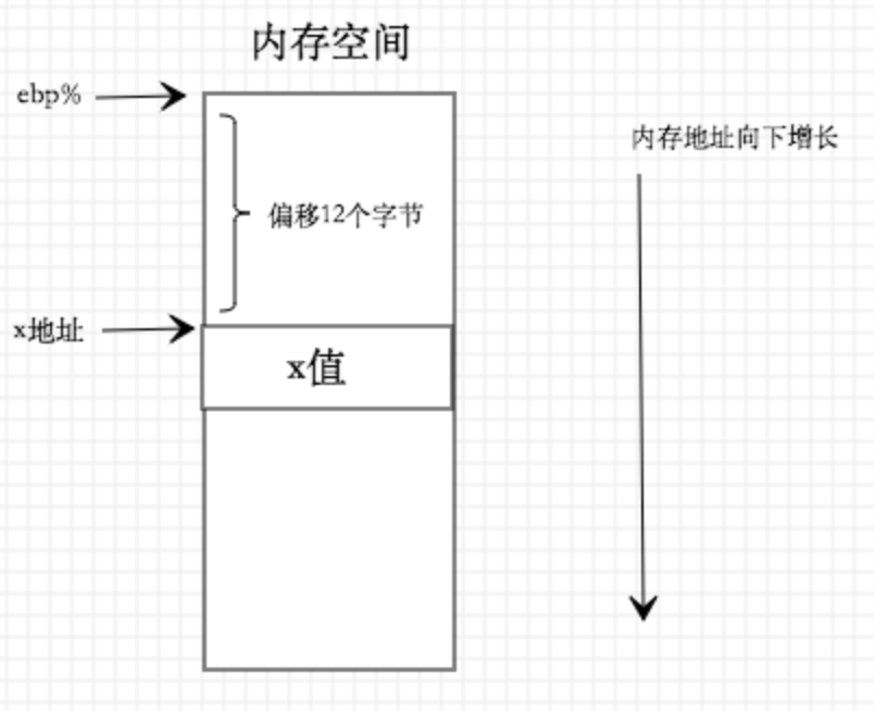 movl 12(%ebp),%eax该指令在原c代码中相当于获取参数x的值,具体功能为:将寄存器%ebp保存的值加上12,然后将得到的值作为内存地址去内存中获取对应值,并保存到%eax寄存器中。可以理解为,%ebp保存着内存某个地址,而参数x的值被放置在该内存地址偏移12(这里的单位是字节)的地方,找到该值后放置到%eax寄存器中,存储状态如下图所示: