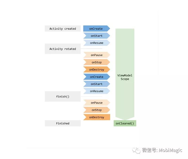 ViewModel的生命周期一直持续到Activity最终销毁或Frament最终detached,期间由于屏幕旋转等配置变化引起的Activity销毁重建并不会导致ViewModel重建。下面是官方的ViewModel生命周期示意图: