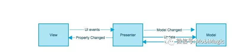 MVVM和我们熟知的MVC、MVP类似,都属于一种架构模式,它的全称是Model–View–ViewModel 。在MVP这类模式当中,一个事件流一般是从View开始,经过P,最后交给M进行处理,但当P处理结束后,可以再通过P或者发布事件的方式再更改V。图示如下: